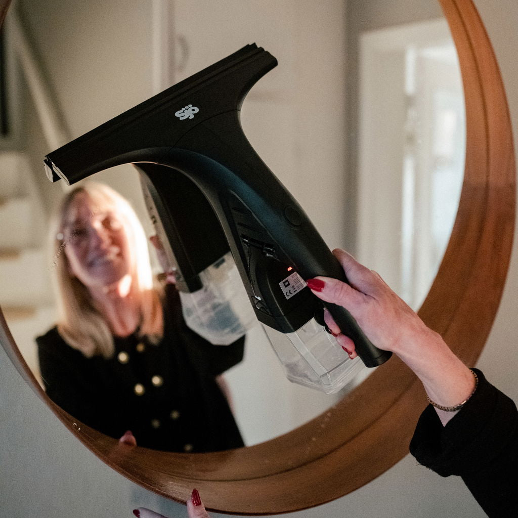 Sjö elektriske vinduesvasker giver stribefri ruder hurtigt og nemt med ledningsfri betjening, 250 ml tank og cirka 20 minutters driftstid til vinduer, spejle og bilruder.