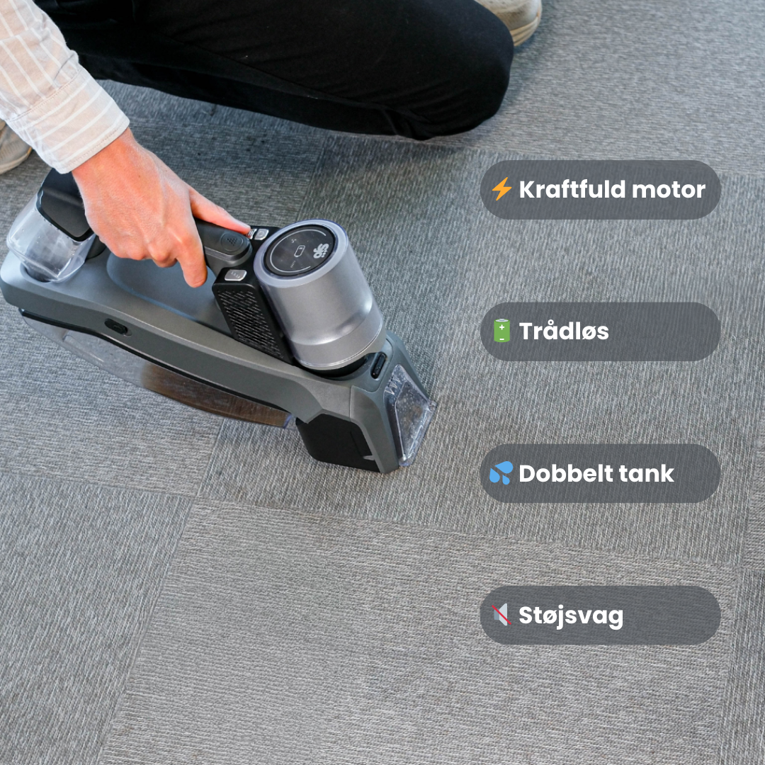Det dobbelte tank-system holder rent og snavset vand adskilt, så du rengør mere hygiejnisk og mere effektivt. Med to børstehoveder kan du tilpasse rengøringen til forskellige overflader, og den støjsvage drift gør den behagelig at bruge i hjemmet.