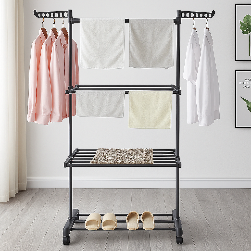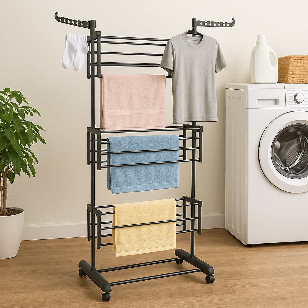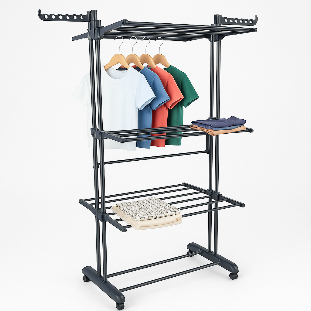Det alsidige Sjö tørrestativ kombinerer nordisk design med funktion: vinger kan klappes ind, længden justeres 75 til 126 cm, konstruktionen bærer op til 20 kg.